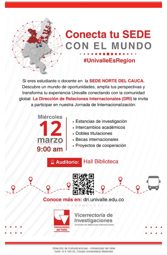 La Direccion de la Sede Amablemente se permite hacer extensiva la invitación a participar en el evento de Jornada de Internacionalización la cual estará a cargo de la Dirección de Relaciones Internacionales de la Universidad del Valle (DRI) que se realizará el próximo miércoles 12 de marzo a las 9:00 a.m. en el Hall de la Biblioteca. Dicho evento contribuye a que nuestros estudiantes tengan conocimiento de las posibilidades de internacionalización y movilidad estudiantil a las que tienen acceso en el marco de una formación integral. Se adjunta pieza publicitaria.